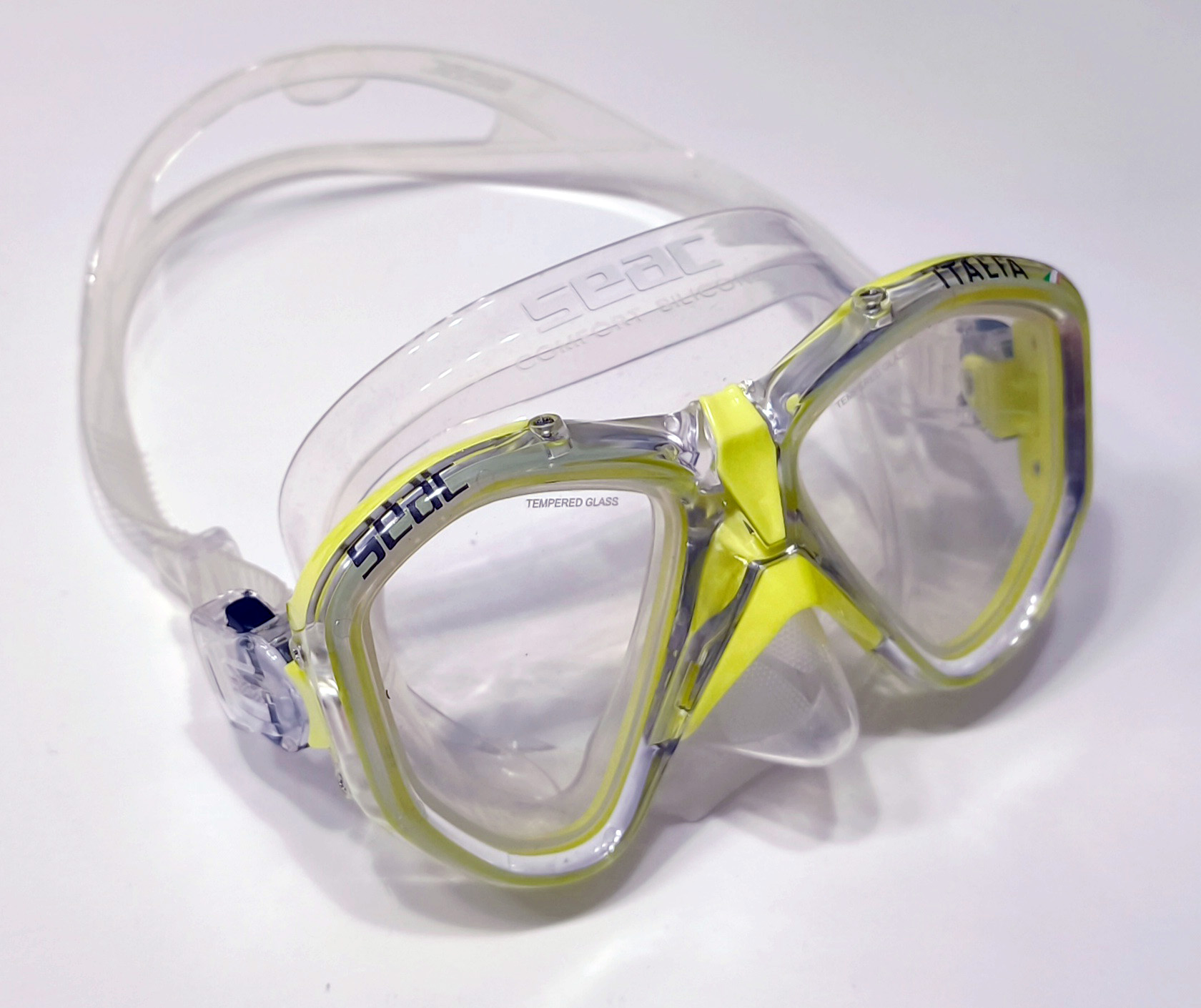 Die Fassung der Seac Italia Maske besteht aus widerstandsfähigem Polycarbonat und enthält zwei Sichtscheiben aus 3 mm dickem Ultra Clear-Glas.